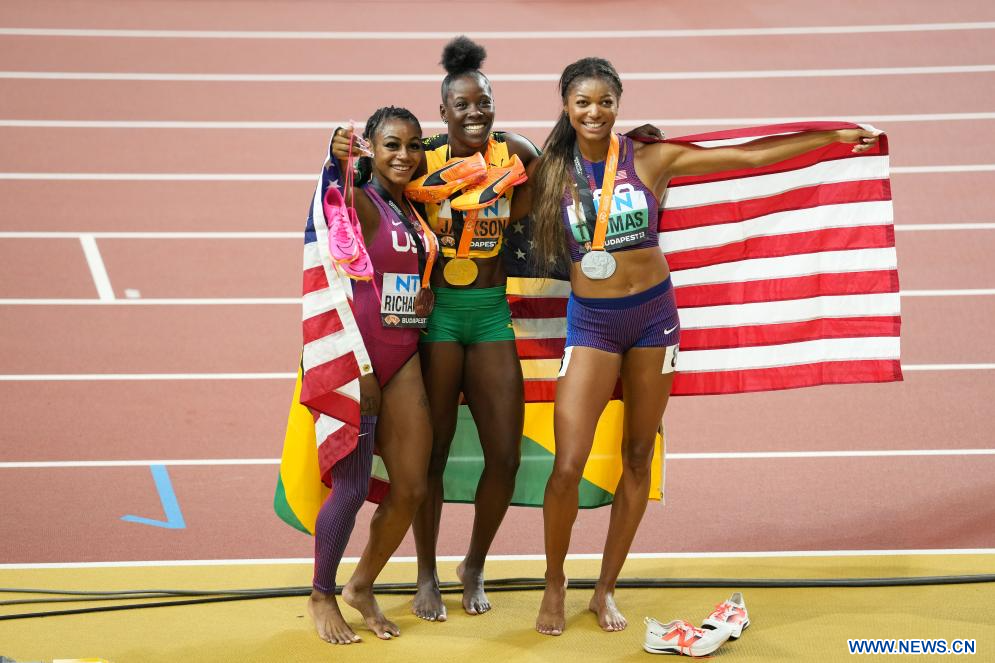 BUDAPEST, 26 agosto, 2023 (Xinhua) -- Imagen del 25 de agosto de 2023 de la medallista de oro Shericka Jackson (c), de Jamaica, la medallista de plata Gabrielle Thomas (d), de Estados Unidos, y la medallista de bronce Sha'Carri Richardson, de Estados Unidos, posando después de la final femenina de 200 metros durante el Campeonato del Mundo de Atletismo de Budapest 2023, en Budapest, Hungría. (Xinhua/Zheng Huansong)