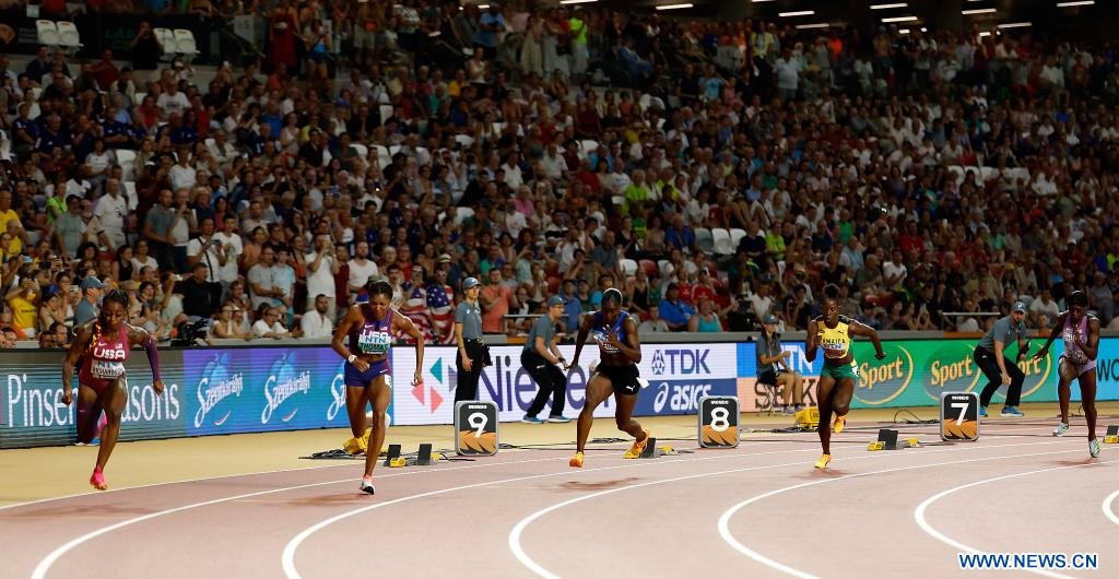 BUDAPEST, 26 agosto, 2023 (Xinhua) -- Imagen del 25 de agosto de 2023 de Shericka Jackson (2-d-frente), de Jamaica, compitiendo durante la final femenina de 200 metros durante el Campeonato del Mundo de Atletismo de Budapest 2023, en Budapest, Hungría. (Xinhua/Wang Lili)