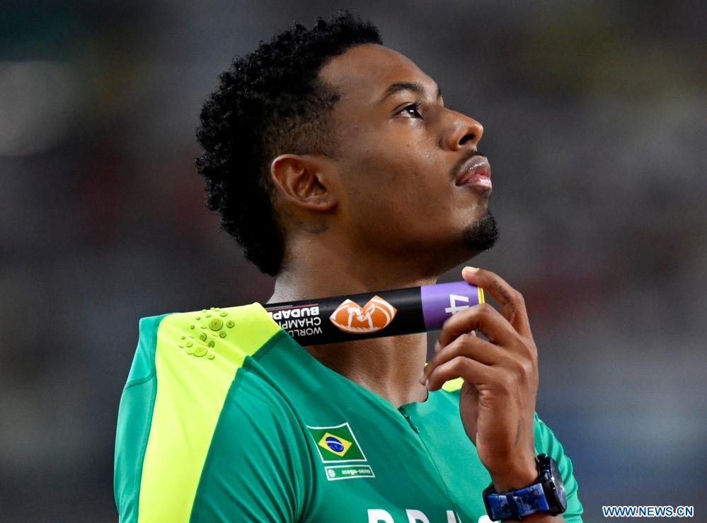 BUDAPEST, 26 agosto, 2023 (Xinhua) -- Imagen del 25 de agosto de 2023 de Paulo André Camilo, de Brasil, reaccionando previo a las eliminatorias masculinas de relevos 4x100m del Campeonato del Mundo de Atletismo de Budapest 2023, en Budapest, Hungría. (Xinhua/Song Yanhua)