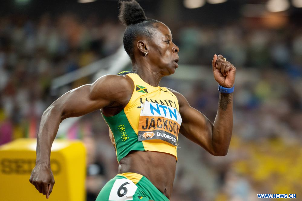 BUDAPEST, 26 agosto, 2023 (Xinhua) -- Imagen del 25 de agosto de 2023 de Shericka Jackson, de Jamaica, compitiendo durante la final femenina de 200 metros durante el Campeonato del Mundo de Atletismo de Budapest 2023, en Budapest, Hungría. (Xinhua/Meng Dingbo)