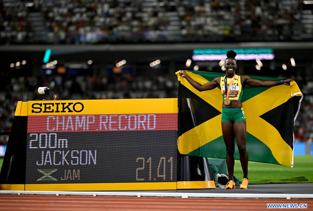 BUDAPEST, 26 agosto, 2023 (Xinhua) -- Imagen del 25 de agosto de 2023 de la medallista de oro Shericka Jackson, de Jamaica, posando con el tablero de récord de campeones después de la final femenina de 200 metros durante el Campeonato del Mundo de Atletismo de Budapest 2023, en Budapest, Hungría. (Xinhua/Song Yanhua)