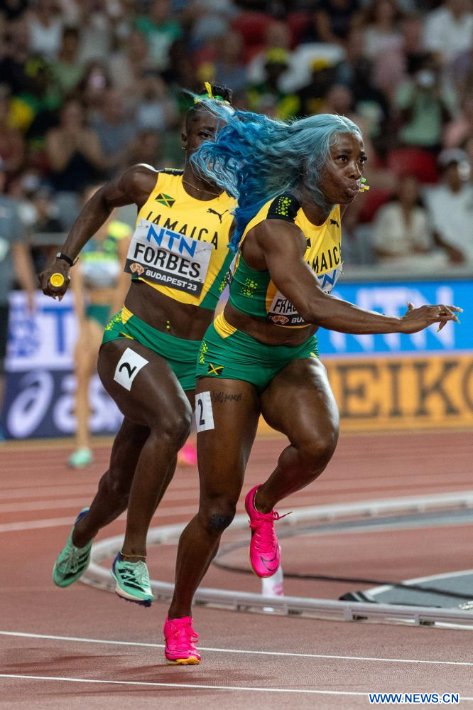 BUDAPEST, 26 agosto, 2023 (Xinhua) -- Imagen del 25 de agosto de 2023 de Shashalee Forbes (i), de Jamaica, pasando la estafeta a su compañera Shelly-Ann Fraser-Pryce durante las eliminatorias femeninas de relevos 4X100 metros durante el Campeonato del Mundo de Atletismo de Budapest 2023, en Budapest, Hungría. (Xinhua/Meng Dingbo)
