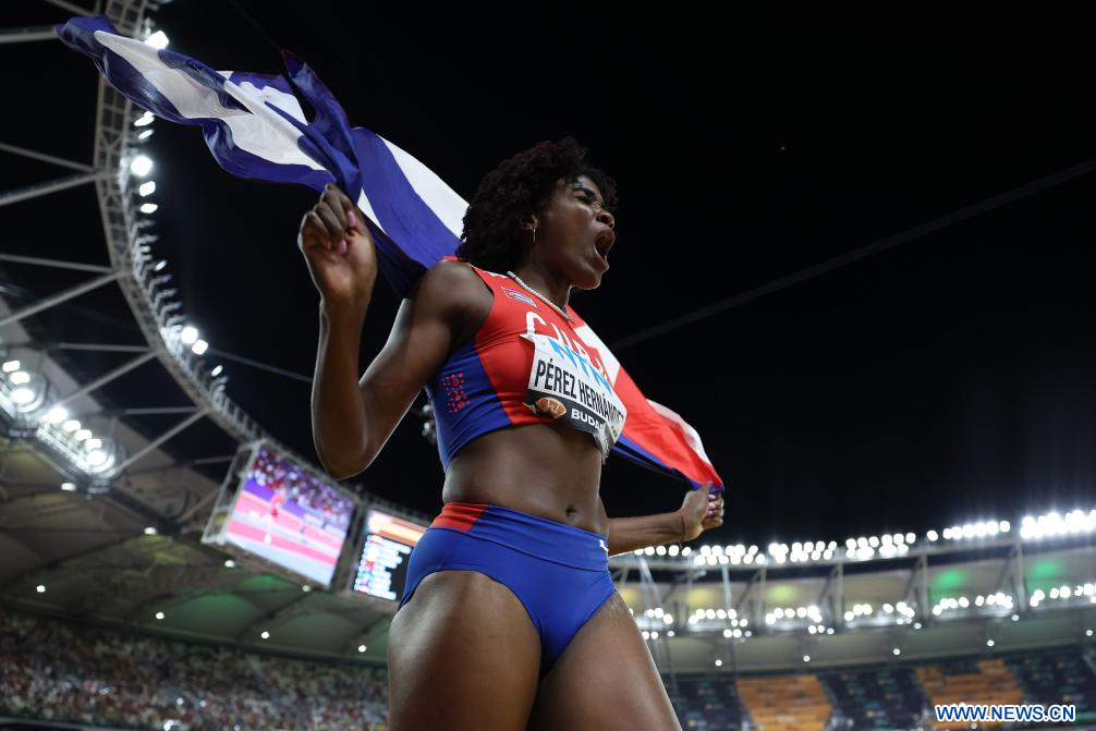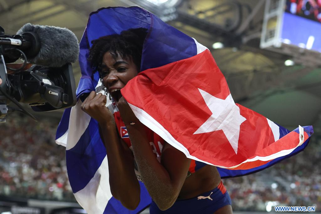 BUDAPEST, 26 agosto, 2023 (Xinhua) -- Imagen del 25 de agosto de 2023 de Leyanis Pérez Hernández, de Cuba, festejando después de la final femenina de salto triple del Campeonato del Mundo de Atletismo de Budapest 2023, en Budapest, Hungría. (Xinhua/Li Ming)