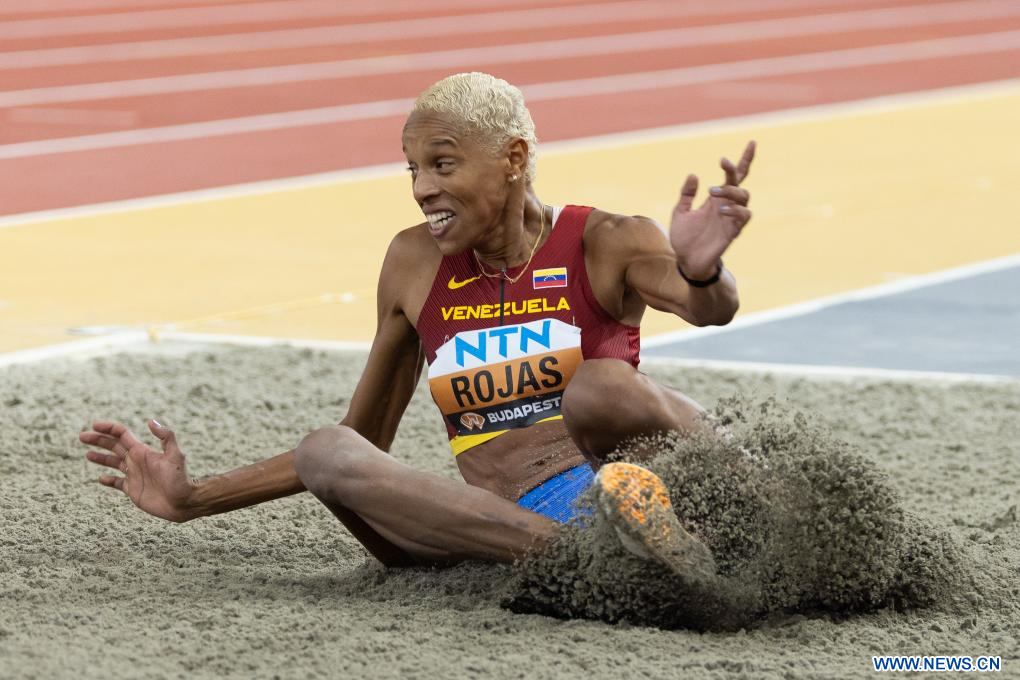 BUDAPEST, 26 agosto, 2023 (Xinhua) -- Imagen del 25 de agosto de 2023 de Yulimar Rojas, de Venezuela, compitiendo durante la final femenina de salto triple del Campeonato del Mundo de Atletismo de Budapest 2023, en Budapest, Hungría. (Xinhua/Attila Volgyi)