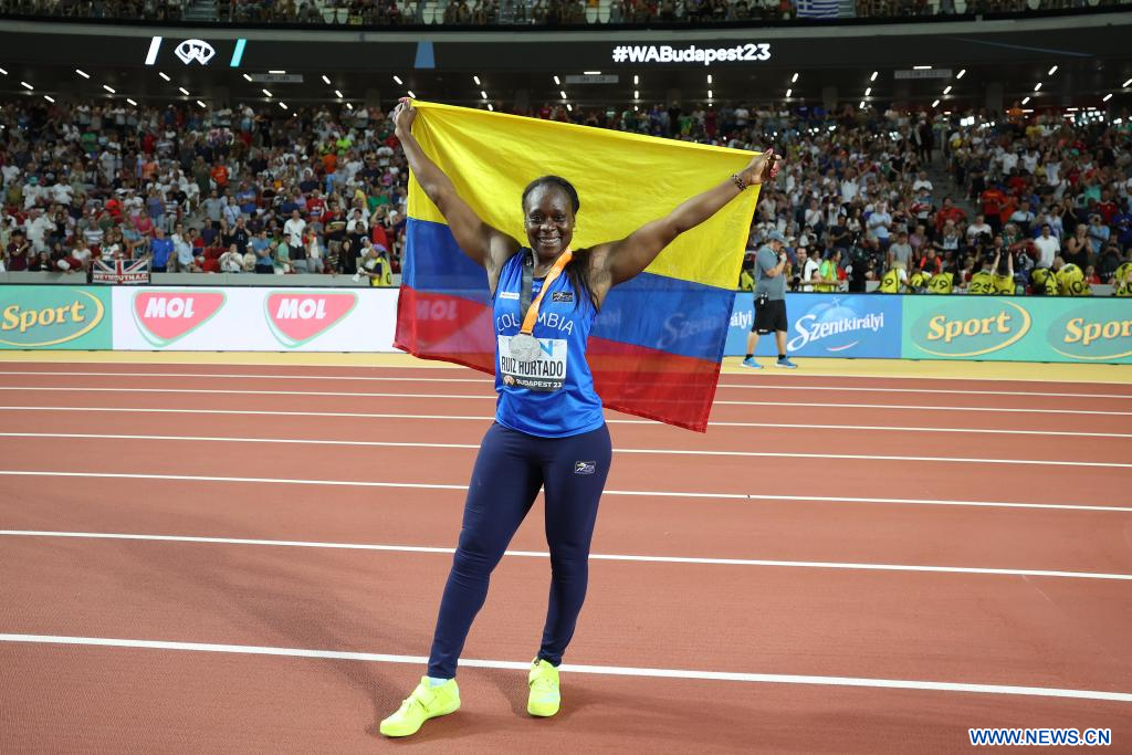 BUDAPEST, 26 agosto, 2023 (Xinhua) -- Imagen del 25 de agosto de 2023 de la medallista de plata, Flor Denis Ruiz Hurtado, de Colombia, festejando después de la final femenina de lanzamiento de jabalina durante el Campeonato del Mundo de Atletismo de Budapest 2023, en Budapest, Hungría. (Xinhua/Li Ming)