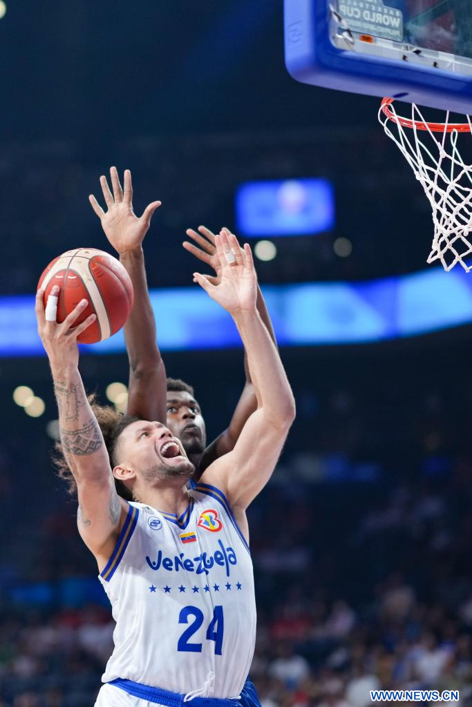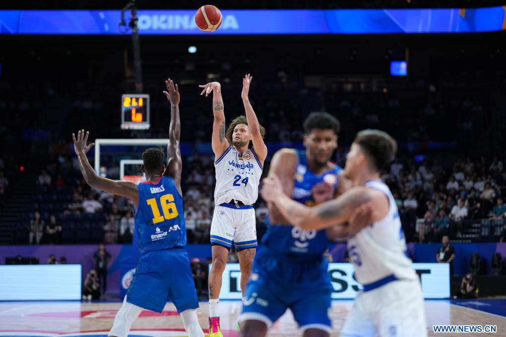 OKINAWA, 28 agosto, 2023 (Xinhua) -- Michael Carrera (2-i), de Venezuela, lanza el balón durante el partido de primera ronda del Grupo F entre Venezuela y Cabo Verde en la Copa Mundial de la FIBA 2023, en Okinawa, Japón, el 28 de agosto de 2023. (Xinhua/Zhang Xiaoyu)