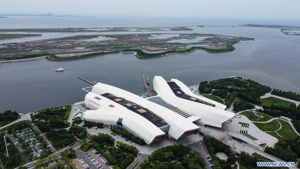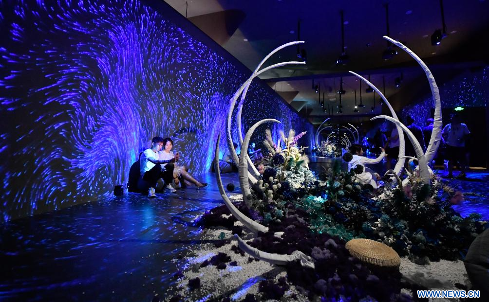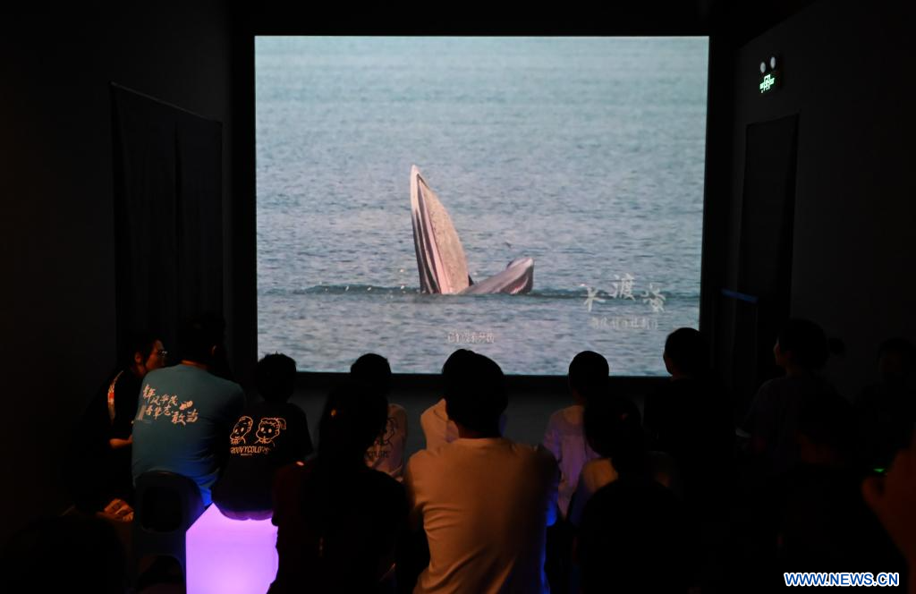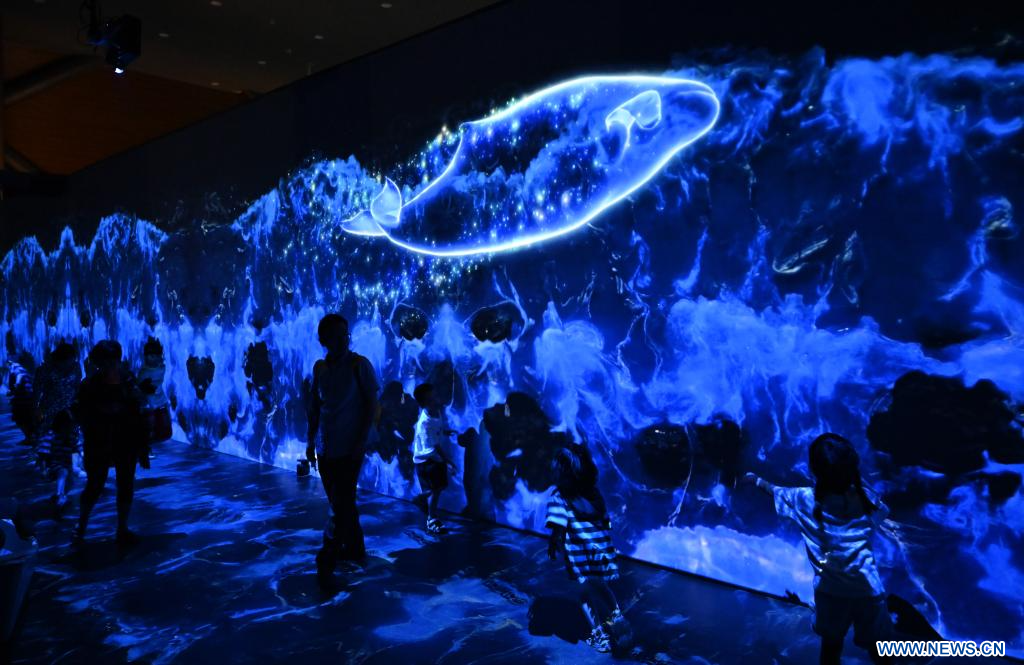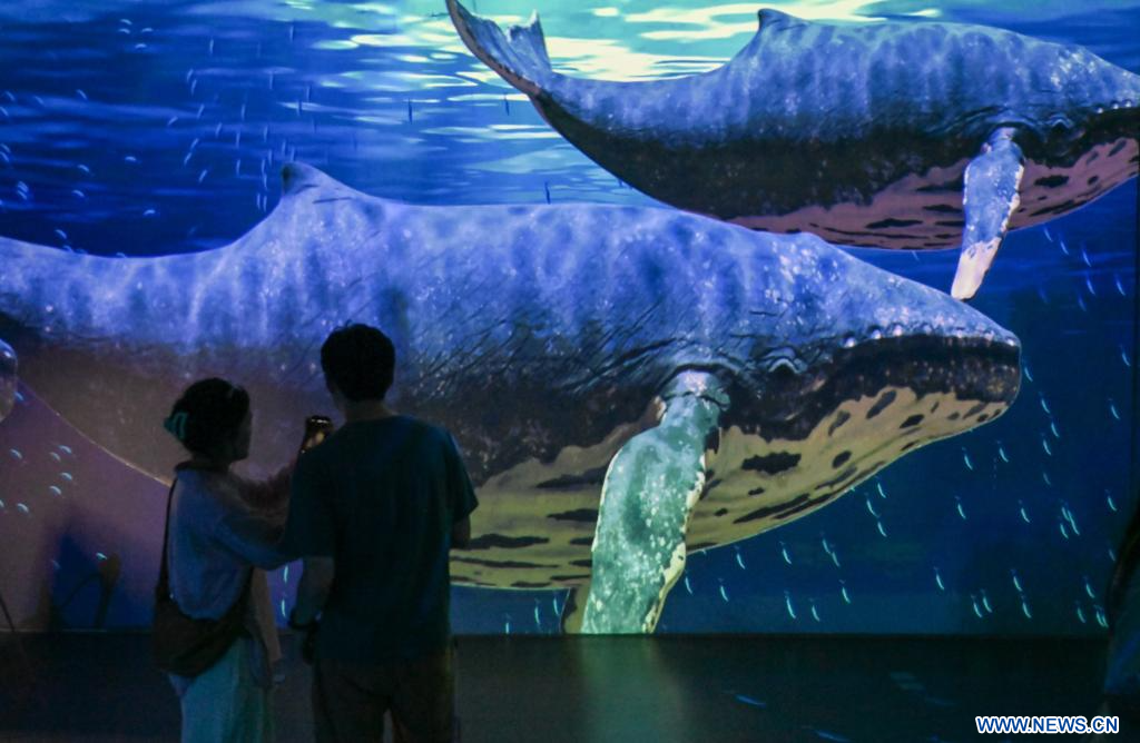 TIANJIN, 27 agosto, 2023 (Xinhua) -- Imagen del 29 de julio de 2023 de personas visitando una exposición temática de ballenas en el Museo Marítimo Nacional de China, en la municipalidad de Tianjin, en el norte de China. El Museo Marítimo Nacional de China es un museo marino integral a nivel nacional que reúne colecciones, exhibiciones, investigación y educación en China. Este verano, aplicó tecnología digital, como la proyección digital y la interacción con Inteligencia Artificial, a una exposición con temática de ballenas para brindar a los visitantes una experiencia inmersiva. (Xinhua/Sun Fanyue)