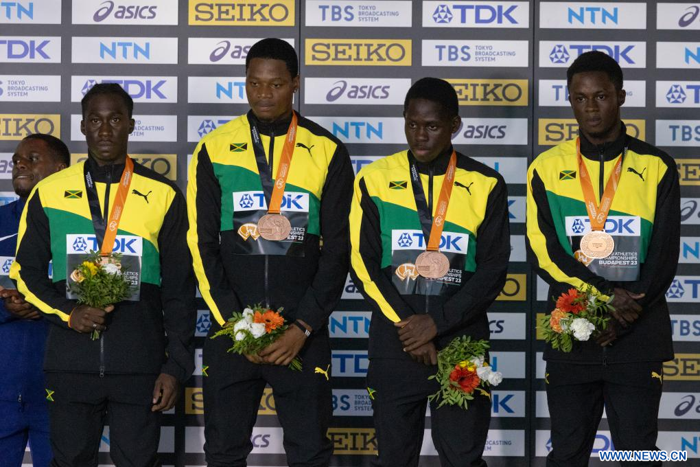 BUDAPEST, 28 agosto, 2023 (Xinhua) -- Imagen del 27 de agosto de 2023 de los medallista de bronce, el equipo de Jamaica, asistiendo a la ceremonia de premiación de los relevos masculinos 4x100 metros del Campeonato del Mundo de Atletismo de Budapest 2023, en Budapest, Hungría. (Xinhua/Attila Volgyi)