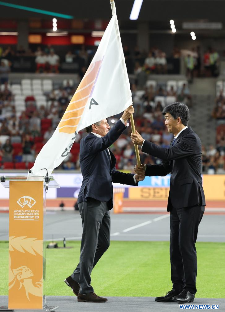 BUDAPEST, 28 agosto, 2023 (Xinhua) -- Imagen del 27 de agosto de 2023 del presidente de World Athletics, Sebastian Coe (i), entregando la bandera a Ogata Mitsugi, presidente de la Asociación Japonesa de Federaciones Atléticas (JAAF, por sus siglas en inglés), durante la ceremonia de clausura del Campeonato del Mundo de Atletismo de Budapest 2023, en Budapest, Hungría. (Xinhua/Li Ming)