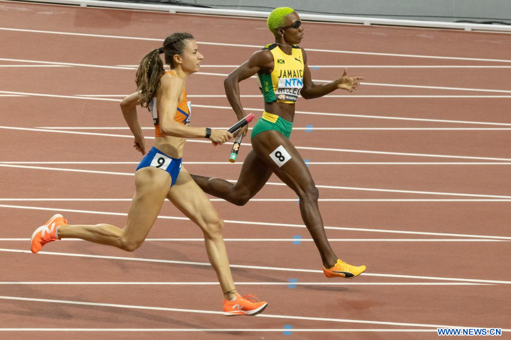 BUDAPEST, 28 agosto, 2023 (Xinhua) -- Imagen del 27 de agosto de 2023 de Eveline Saalberg (i), de Países Bajos y Candice McLeod, de Jamaica, compitiendo durante la final femenina de relevos 4x400 metros del Campeonato del Mundo de Atletismo de Budapest 2023, en Budapest, Hungría. (Xinhua/Attila Volgyi)