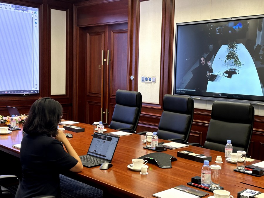 Zeng Ming, gerente de proyecto de la oficina TECH4ALL de Huawei habla en una videollamada con Samira Herrera, gerente de Comunicación y Relaciones Públicas de Huawei México, Shenzhen, China, el 18 de agosto, 2023. (Xinhua/Cheng Chixiang)