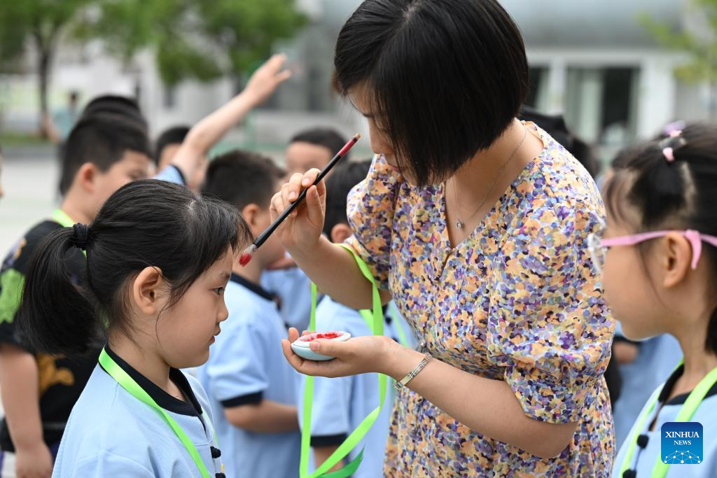 HEFEI, 30 agosto, 2023 (Xinhua) -- Una maestra pinta un punto rojo en la frente de los niños recién admitidos en la escuela primaria de la carretera Tunxi, en Hefei, en la provincia de Anhui, en el este de China, el 30 de agosto de 2023. El punto rojo representa la apertura del ojo de la sabiduría en la cultura tradicional de China. (Xinhua/Zhou Mu)