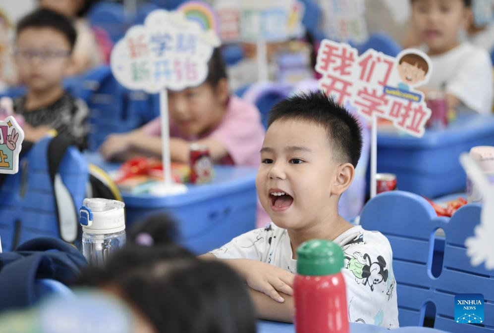 HEFEI, 30 agosto, 2023 (Xinhua) -- Un niño responde preguntas en un salón de clases en la escuela primaria Hupo del distrito de Shushan, en Hefei, en la provincia de Anhui, en el este de China, el 30 de agosto de 2023. (Xinhua/Chen Sanhu)