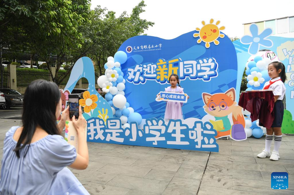 CHONGQING, 30 agosto, 2023 (Xinhua) -- Una niña de primer grado posa para fotografías en la escuela primaria Yajule, en el distrito de Nan'an de Chongqing, en el suroeste de China, el 30 de agosto de 2023. (Xinhua/Wang Quanchao)