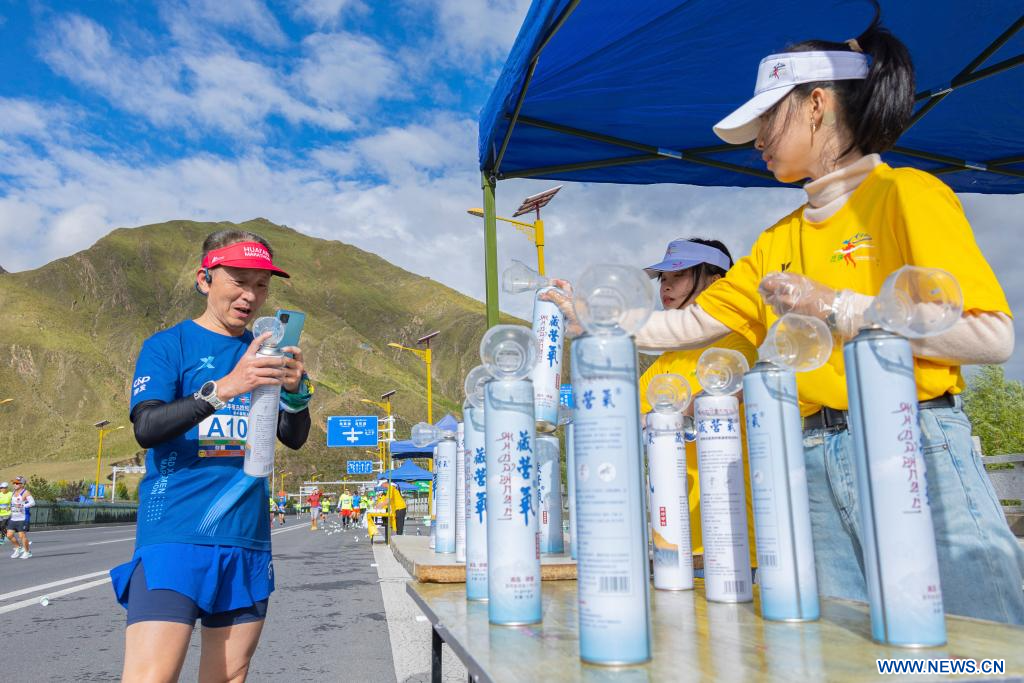 LHASA, 28 agosto, 2023 (Xinhua) -- Imagen del 27 de agosto de 2023 de un corredor buscando un bote de oxígeno durante la Media Maratón de Lhasa, en Lhasa, en la región autónoma del Tíbet, en el suroeste de China. (Xinhua/Tenzin Nyida)