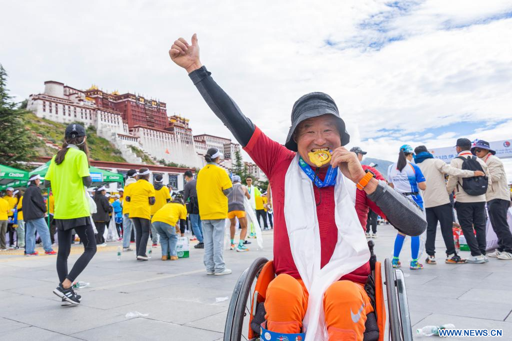 LHASA, 28 agosto, 2023 (Xinhua) -- Imagen del 27 de agosto de 2023 de un corredor completando la Media Maratón de Lhasa en silla de ruedas, en Lhasa, en la región autónoma del Tíbet, en el suroeste de China. (Xinhua/Tenzin Nyida)