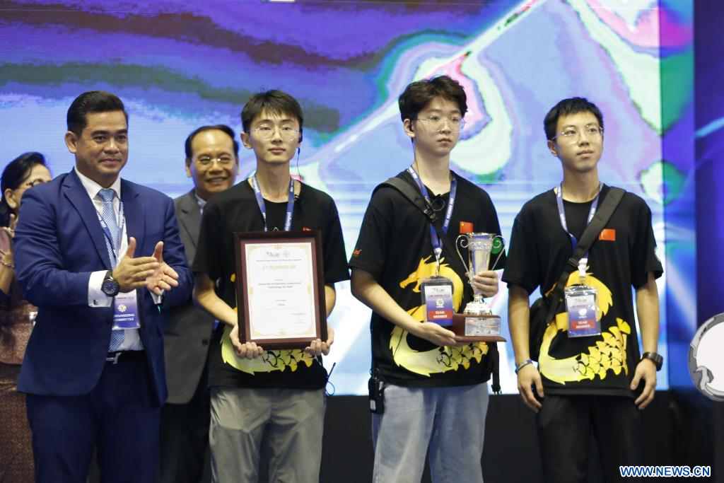 PHNOM PENH, 27 agosto, 2023 (Xinhua) -- Miembros del equipo de la Universidad de Ciencia y Tecnología Electrónica de China posan para fotografías durante el Concurso de Robots Asia-Pacífico 2023 de la Unión de Radiodifusión de Asia y el Pacífico (ABU Robocon), en Phnom Penh, Camboya, el 27 de agosto de 2023. El ABU Robocon 2023 fue celebrado el domingo en Camboya, con la participación de 14 equipos universitarios de más de 10 países. (Xinhua/Sovannara)