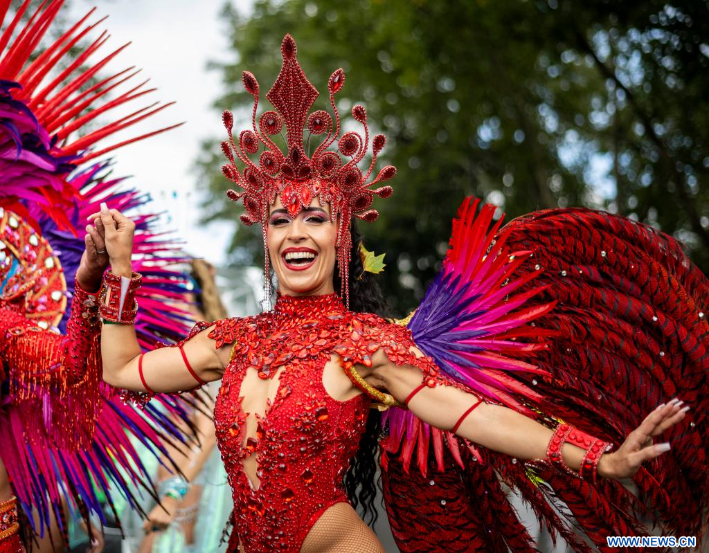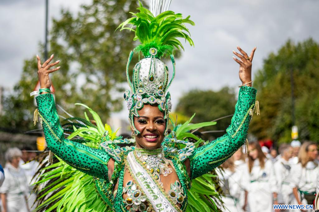 LONDRES, 29 agosto, 2023 (Xinhua) -- Imagen del 28 de agosto de 2023 de una artista participando en el Carnaval de Notting Hill, en Londres, Reino Unido. Originado en la década de 1960, el carnaval es una forma en la que las comunidades afrocaribeñas pueden celebrar sus culturas y tradiciones. (Xinhua/Stephen Chung)