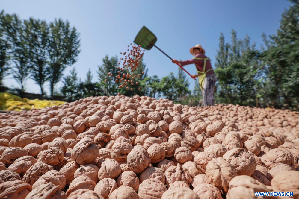 BEIJING, 1 septiembre, 2023 (Xinhua) -- Imagen del 30 de agosto de 2023 de agricultores secando nueces, en el poblado de Dongjiuzhai, en la ciudad de Zunhua, en la provincia de Hebei, en el norte de China. (Xinhua/Liu Mancang)