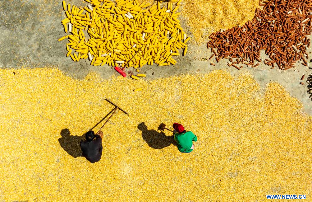 BEIJING, 1 septiembre, 2023 (Xinhua) -- Vista aérea del 31 de agosto de 2023 de agricultores secando maíz, en el poblado de Guanyindong, en la ciudad de Qianxi, en la provincia de Guizhou, en el suroeste de China. (Xinhua/Fan Hui)