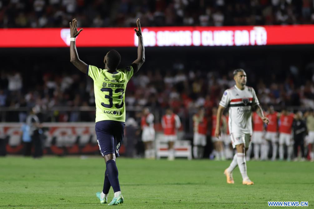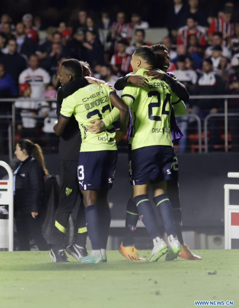 SAO PAULO, 1 septiembre, 2023 (Xinhua) -- Imagen del 31 de agosto de 2023 del jugador Leonel Quiñonez (i), de Liga de Quito de Ecuador, festejando una anotación durante el partido de vuelta de los cuartos de final de la Copa Conmebol Sudamericana 2023, ante Sao Paulo de Brasil, celebrado en el Estado Morumbi, en Sao Paulo, Brasil. (Xinhua/Rahel Patrasso)