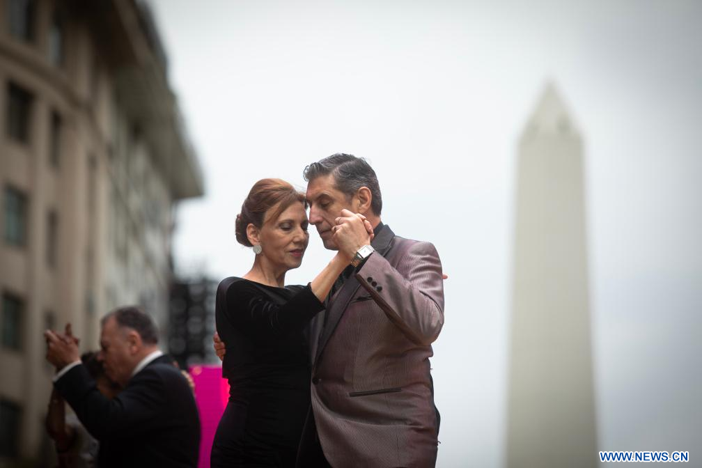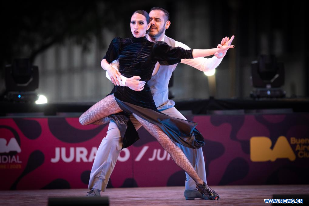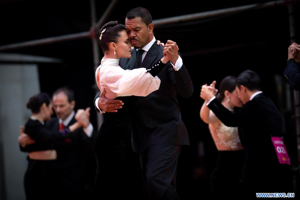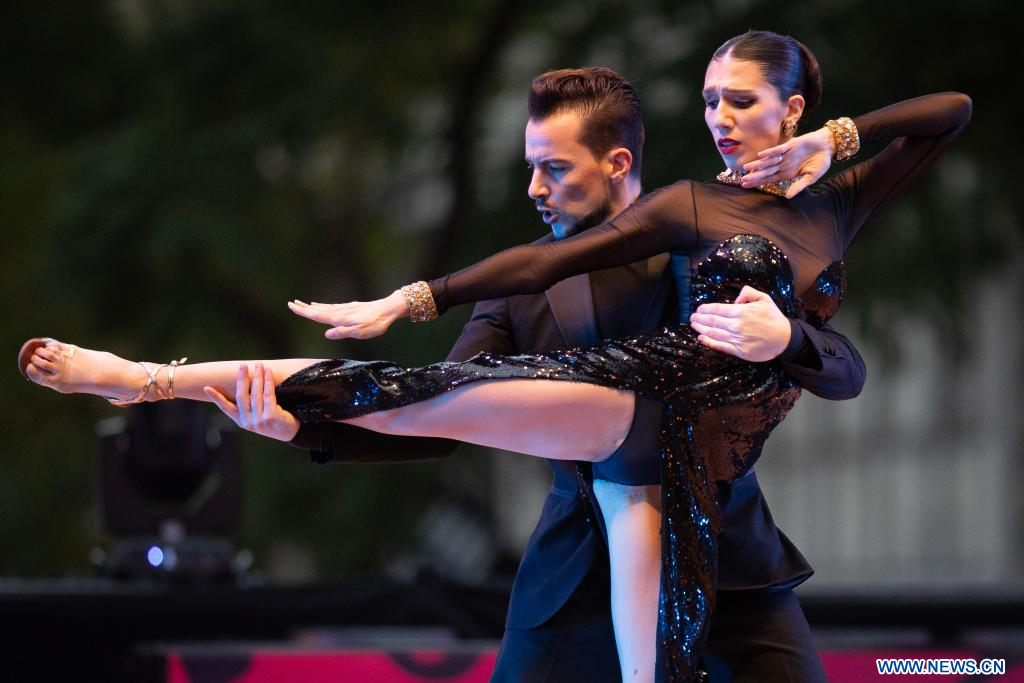 BUENOS AIRES, 2 septiembre, 2023 (Xinhua) -- Los concursantes ganadores del campeonato europeo, Evgeniia Samoilova (i) y Luis Squicciarini (d), compiten en la final de la categoría Tango Escenario durante el Mundial de Tango, en la Diagonal Roque Sáenz Peña frente al Obelisco, en la ciudad de Buenos Aires, capital de Argentina, el 2 de septiembre de 2023. (Xinhua/Martín Zabala)