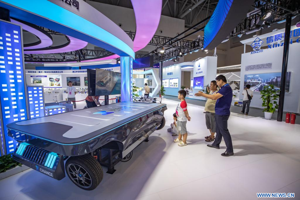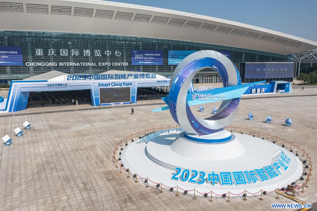 CHONGQING, 3 septiembre, 2023 (Xinhua) -- Invitados visitan la sede de la Exposición China Inteligente 2023, en Chongqing, en el suroeste de China, el 3 de septiembre de 2023. La Exposición China Inteligente 2023 se celebrará en el Centro Internacional de Exposiciones de Chongqing del 4 al 6 de septiembre. (Xinhua/Wang Quanchao)
