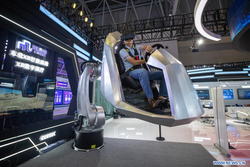 CHONGQING, 3 septiembre, 2023 (Xinhua) -- Un periodista experimenta una cabina inteligente XR dentro de un vehículo en la sede de la Exposición China Inteligente 2023, en Chongqing, en el suroeste de China, el 3 de septiembre de 2023. La Exposición China Inteligente 2023 se celebrará en el Centro Internacional de Exposiciones de Chongqing del 4 al 6 de septiembre. (Xinhua/Chu Jiayin)