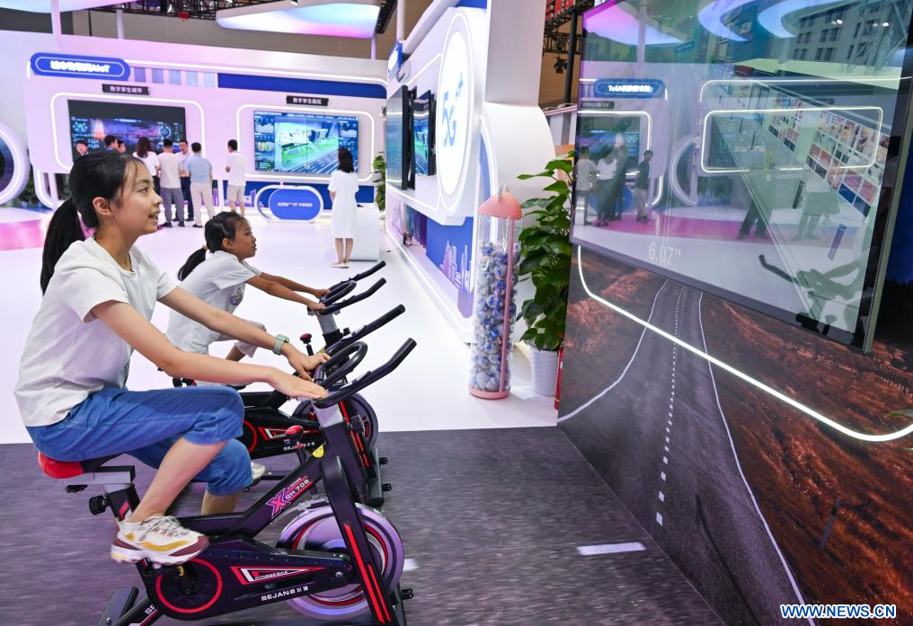 CHONGQING, 3 septiembre, 2023 (Xinhua) -- Niños experimentan un dispositivo digital en la sede de la Exposición China Inteligente 2023, en Chongqing, en el suroeste de China, el 3 de septiembre de 2023. La Exposición China Inteligente 2023 se celebrará en el Centro Internacional de Exposiciones de Chongqing del 4 al 6 de septiembre. (Xinhua/Wang Quanchao)