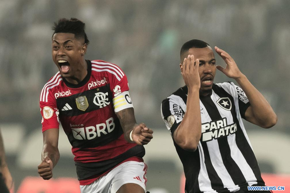 RÍO DE JANEIRO, 3 septiembre, 2023 (Xinhua) -- Imagen del 2 de septiembre de 2023 del jugador Bruno Henrique (i), de Flamengo, festejando su anotación durante el partido correspondiente al Campeonato Brasileño 2023-Serie A ante Botafogo, celebrado en el Estadio Nilton Santos, en Río de Janeiro, Brasil. (Xinhua/Claudia Martini)