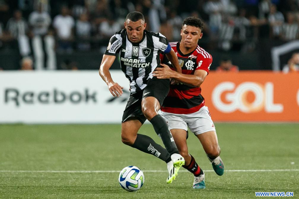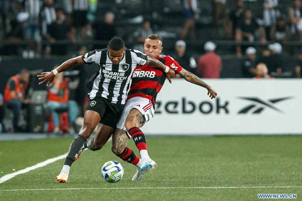 RÍO DE JANEIRO, 3 septiembre, 2023 (Xinhua) -- Imagen del 2 de septiembre de 2023 del jugador Junior Santos (i), de Botafogo, disputando el balón con Everton (d), de Flamengo, durante el partido correspondiente al Campeonato Brasileño 2023-Serie A, celebrado en el Estadio Nilton Santos, en Río de Janeiro, Brasil. (Xinhua/Claudia Martini)