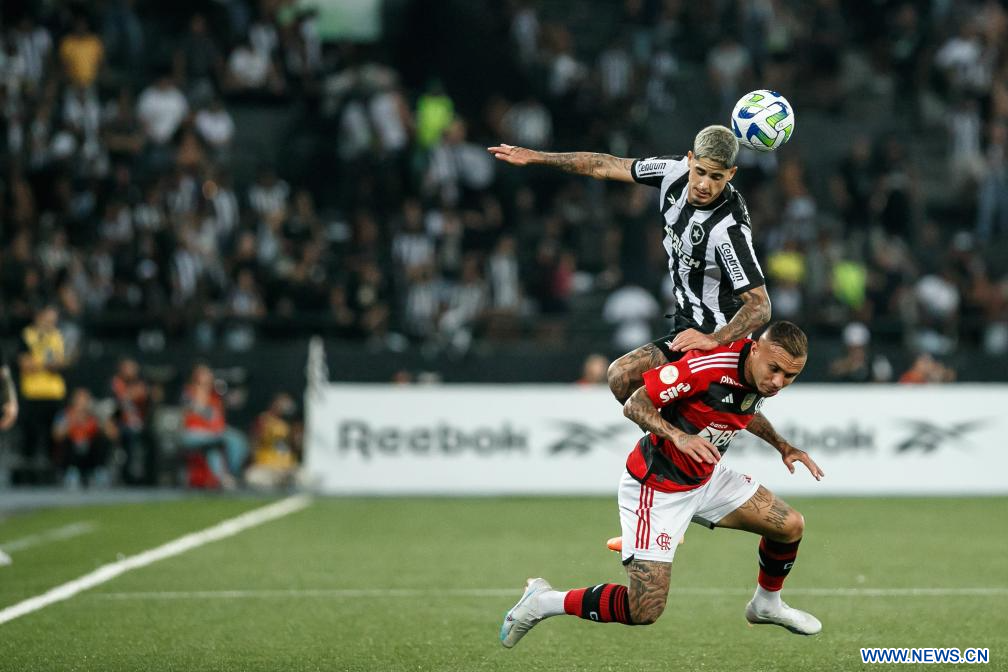 RÍO DE JANEIRO, 3 septiembre, 2023 (Xinhua) -- Imagen del 2 de septiembre de 2023 del jugador Fernando Marcal (i), de Botafogo, disputando el balón con Victor Hugo (d), de Flamengo, durante el partido correspondiente al Campeonato Brasileño 2023-Serie A, celebrado en el Estadio Nilton Santos, en Río de Janeiro, Brasil. (Xinhua/Claudia Martini)