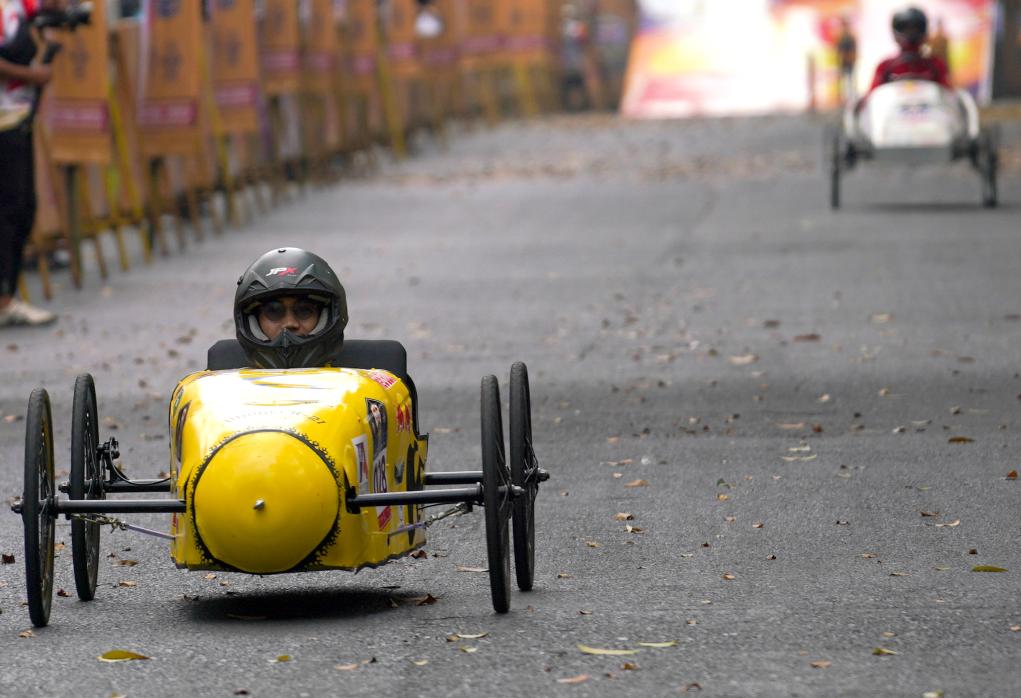 BANDUNG, 26 agosto, 2023 (Xinhua) -- Un competidor conduce su vehículo casero sin motor durante la Carrera de Cajas de Jabón, en Bandung, Java Occidental, Indonesia, el 26 de agosto de 2023. (Xinhua/Septianjar Muharam)