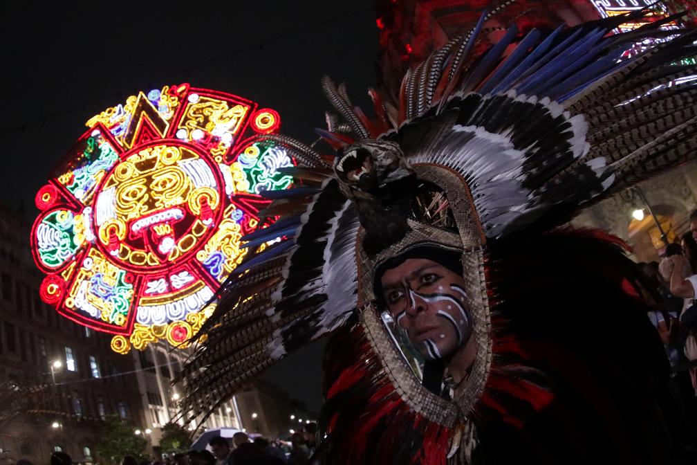 CIUDAD DE MÉXICO, 5 septiembre, 2023 (Xinhua) -- Imagen del 4 de septiembre de 2023 de un danzante observando el alumbrado decorativo colocado con motivo del 213º Aniversario de la Independencia de México, en el Zócalo de la Ciudad de México, capital de México. (Xinhua/Francisco Cañedo)