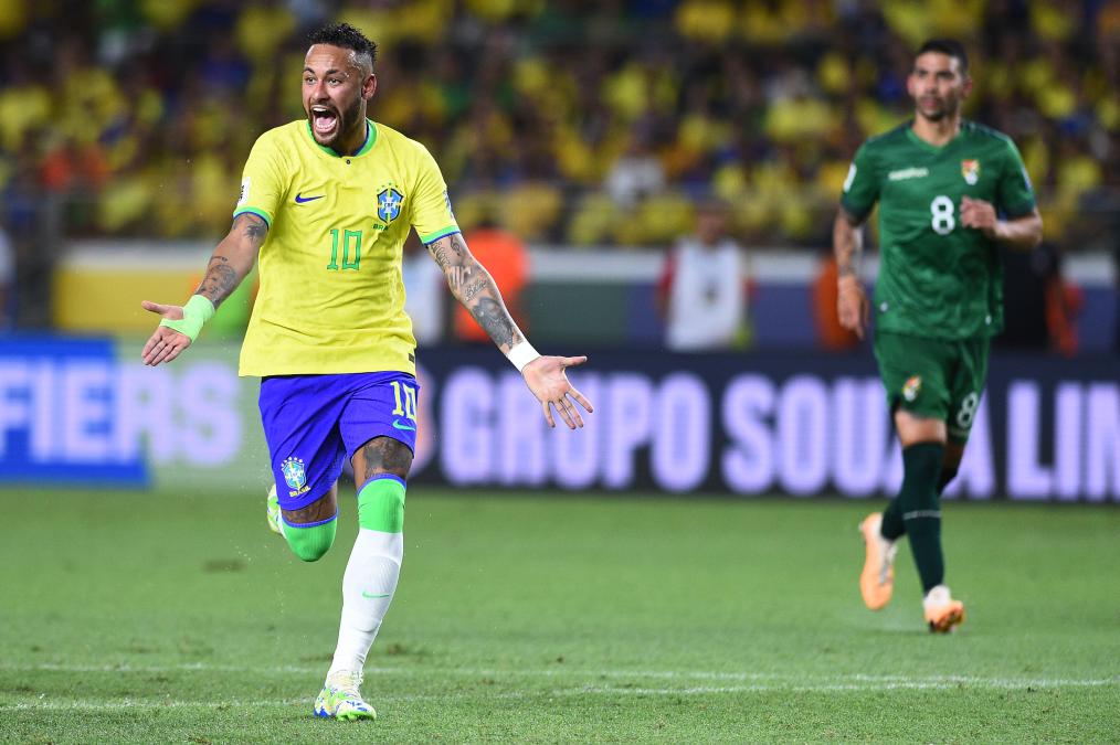 BELEM, 9 septiembre, 2023 (Xinhua) -- Imagen del 8 de septiembre de 2023 de Neymar (i), de Brasil, festejando durante el partido por la primera fecha de las Eliminatorias Sudamericanas para el Mundial de Estados Unidos, México y Canadá 2026, ante Bolivia, en el Estadio Olímpico do Pará, en Belém, capital del estado de Pará, Brasil. (Xinhua/Lucio Tavora)