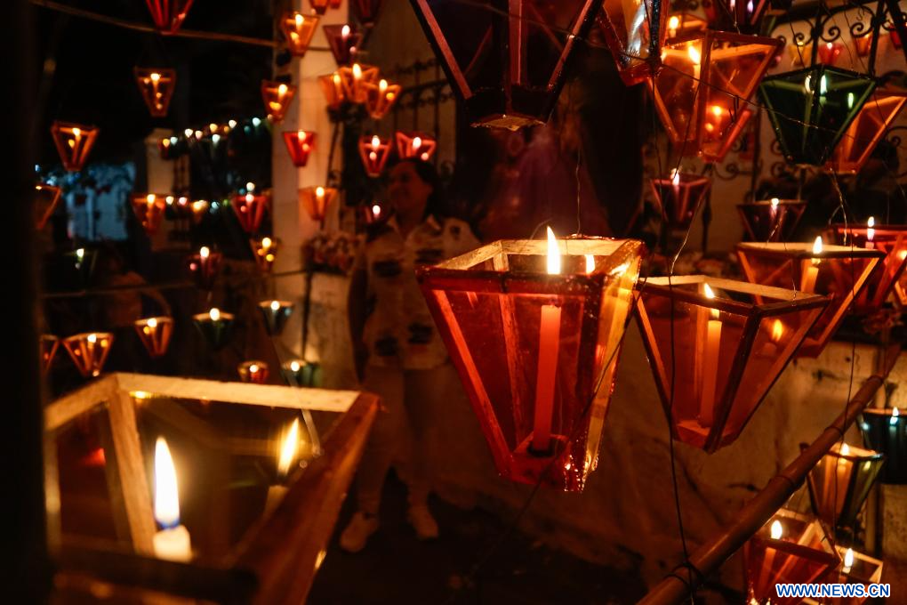 AHUACHAPAN, 8 septiembre, 2023 (Xinhua) -- Imagen del 7 de septiembre de 2023 de una mujer colocando adornos con velas en su vivienda durante el Festival de los Farolitos, en el municipio de Concepción de Ataco, en el departamento de Ahuachapán, El Salvador. (Xinhua/Alexander Peña)