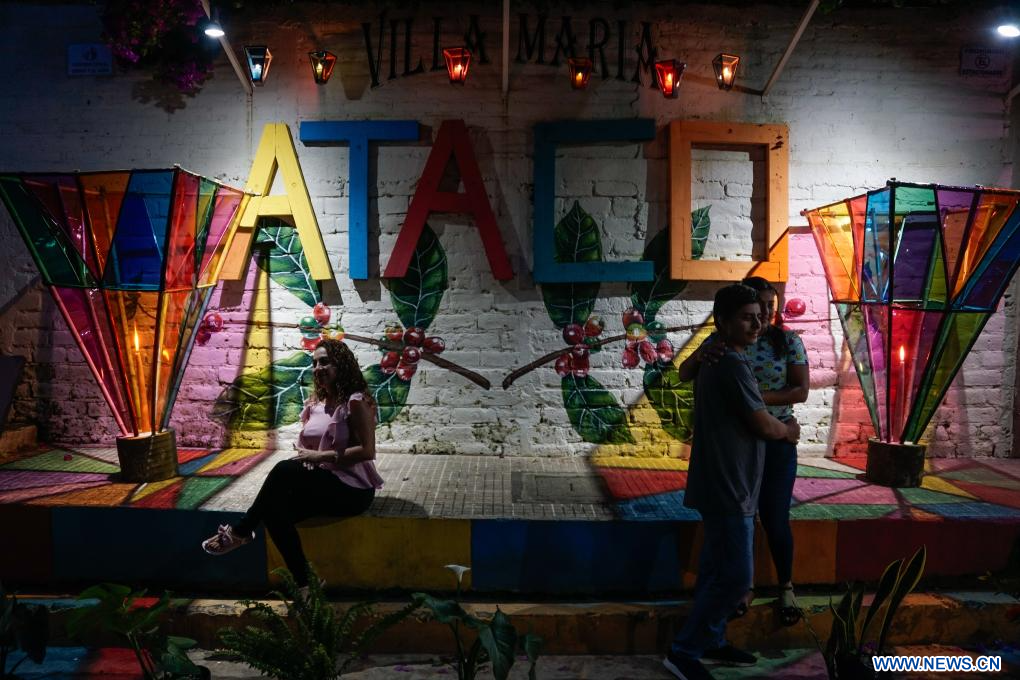 AHUACHAPAN, 8 septiembre, 2023 (Xinhua) -- Imagen del 7 de septiembre de 2023 de personas tomándose fotografías con adornos de farolitos gigantes durante el Festival de los Farolitos, en el municipio de Concepción de Ataco, en el departamento de Ahuachapán, El Salvador. (Xinhua/Alexander Peña)