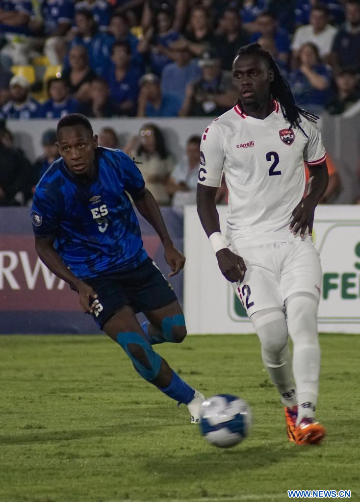 SAN SALVADOR, 11 septiembre, 2023 (Xinhua) -- Imagen del 10 de septiembre de 2023 de Brayan Gil (i), de El Salvador, disputando el balón con Aubrey David (d), de Trinidad y Tobago, durante el partido correspondiente a la Liga de Naciones de la CONCACAF celebrado en el Estadio Nacional Jorge "El Mágico" González, en el departamento de San Salvador, El Salvador. (Xinhua/Alexander Peña)