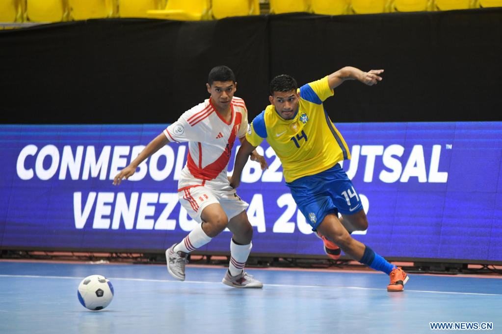 LA GUAIRA, 13 septiembre, 2023 (Xinhua) -- El jugador Luis Julon (i), de Perú, disputa el balón con Regivanderson Salgueiro (d), de Brasil, durante el partido correspondiente a la fase de grupos de la copa CONMEBOL Sub20 Futsal 2022, celebrado en el Domo José María Vargas, en el estado La Guaira, Venezuela, el 13 de septiembre de 2023. (Xinhua/Marcos Salgado)
