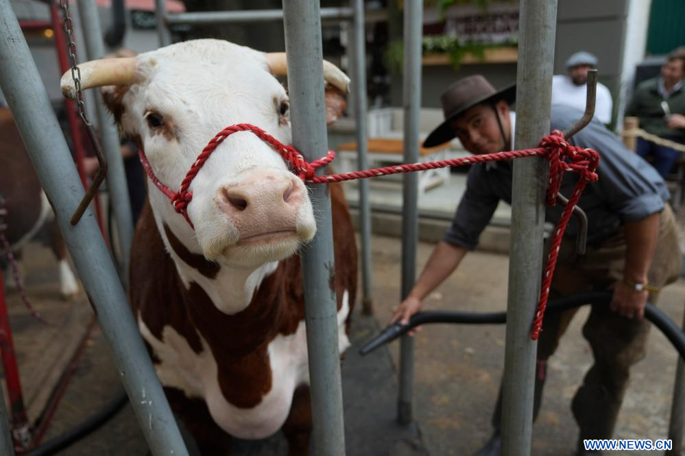 MONTEVIDEO, 11 septiembre, 2023 (Xinhua) -- Un hombre traslada a un toro durante la 118 Exposición Internacional de Ganadería Muestra Agroindustrial y Comercial "Expo Prado 2023", en el Predio de Exposiciones de la Rural del Prado, en Montevideo, capital de Uruguay, el 11 de septiembre de 2023. (Xinhua/Nicolás Celaya)