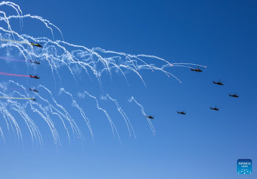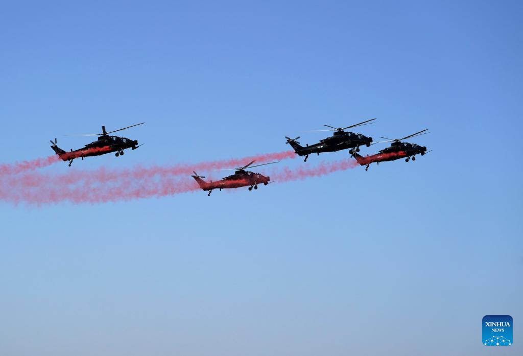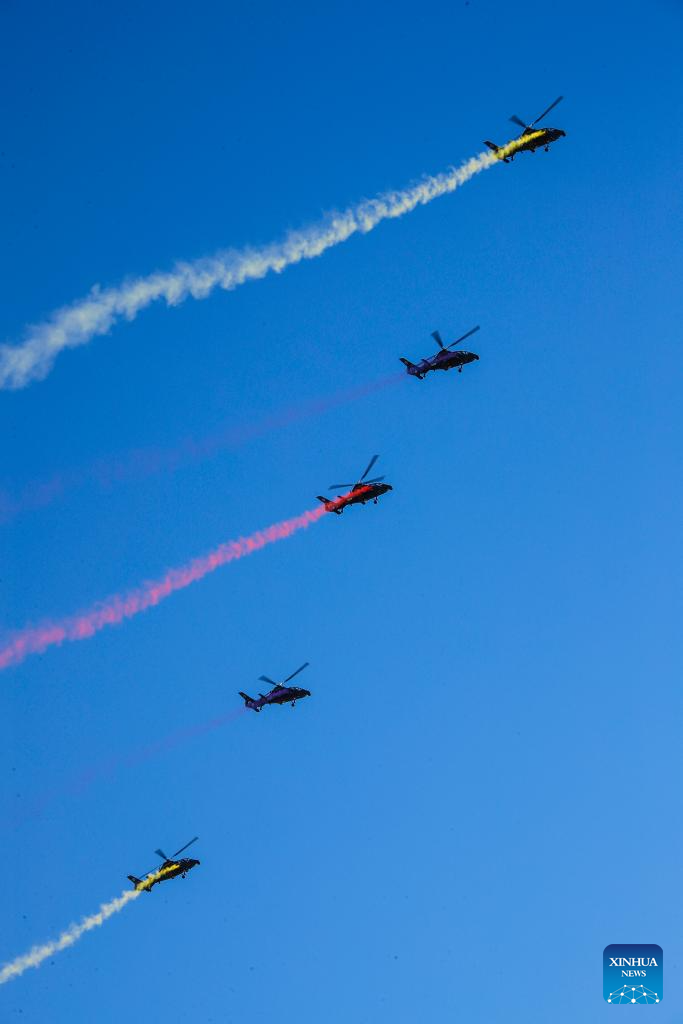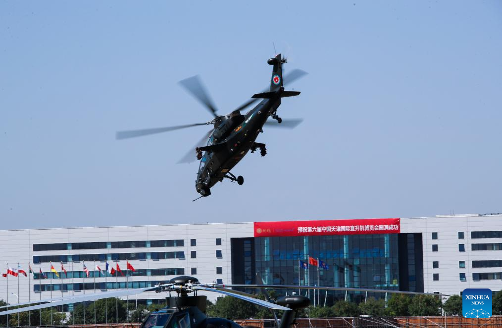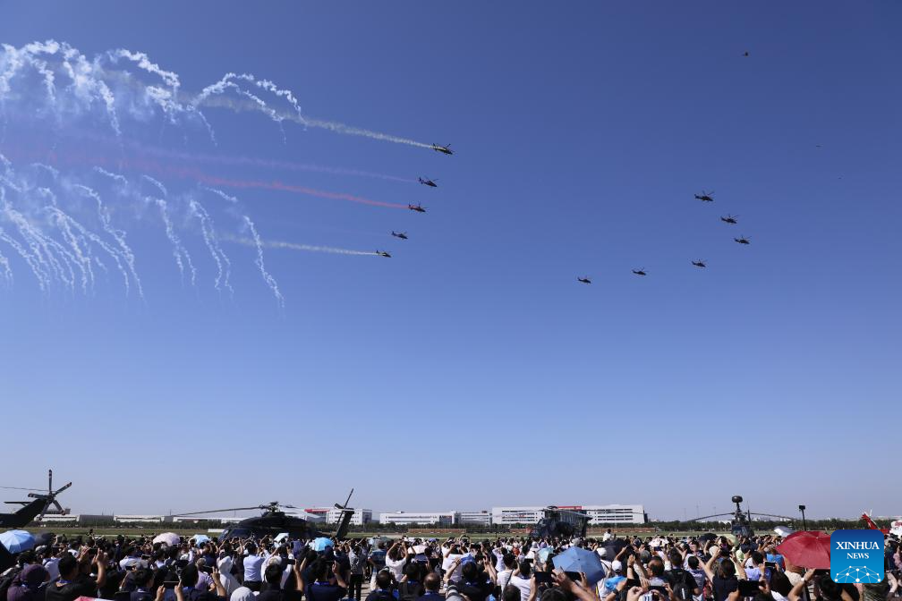 TIANJIN, 15 septiembre, 2023 (Xinhua) -- Imagen del 14 de septiembre de 2023 de un helicóptero del equipo acrobático Fenglei de China durante una presentación en la ceremonia de inauguración de la VI Exposición de Helicópteros de China, en la municipalidad de Tianjin, en el norte de China. La VI Exposición de Helicópteros de China fue inaugurada el jueves en la municipalidad de Tianjin, en el norte de China, destacando la innovación, el desarrollo y la cooperación beneficiosa para todas las partes. La exposición acogerá actividades como exposiciones, foros, exhibiciones aéreas, lanzamientos de nuevos productos y negociaciones comerciales, y tiene como objetivo promover la innovación, la cooperación y el desarrollo en la industria mundial de helicópteros. Se espera que atraiga a más de 60.000 visitantes. (Xinhua/Zhang Yongjin)
