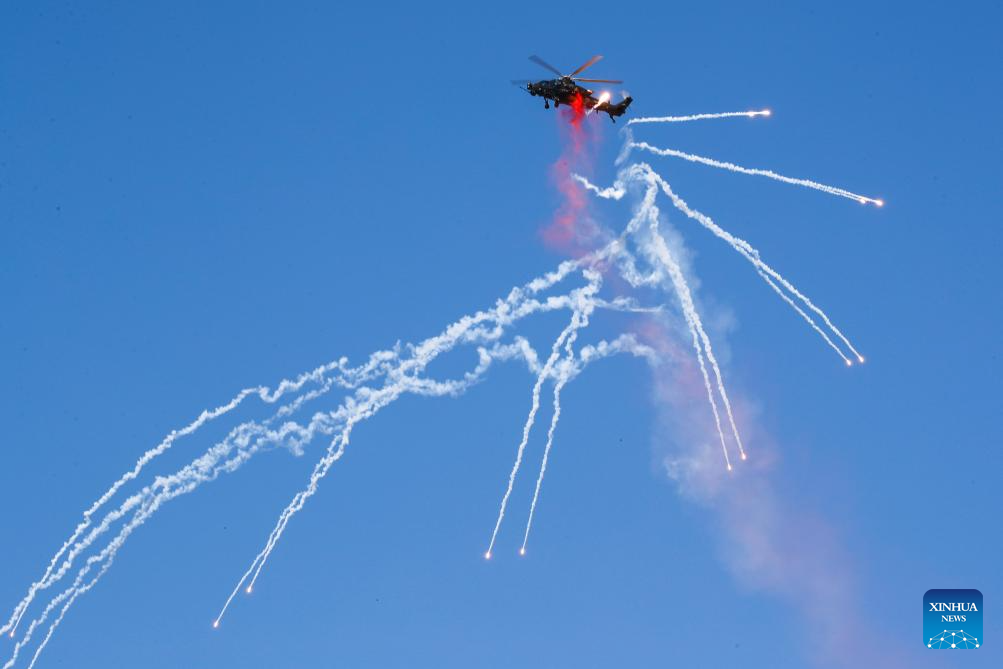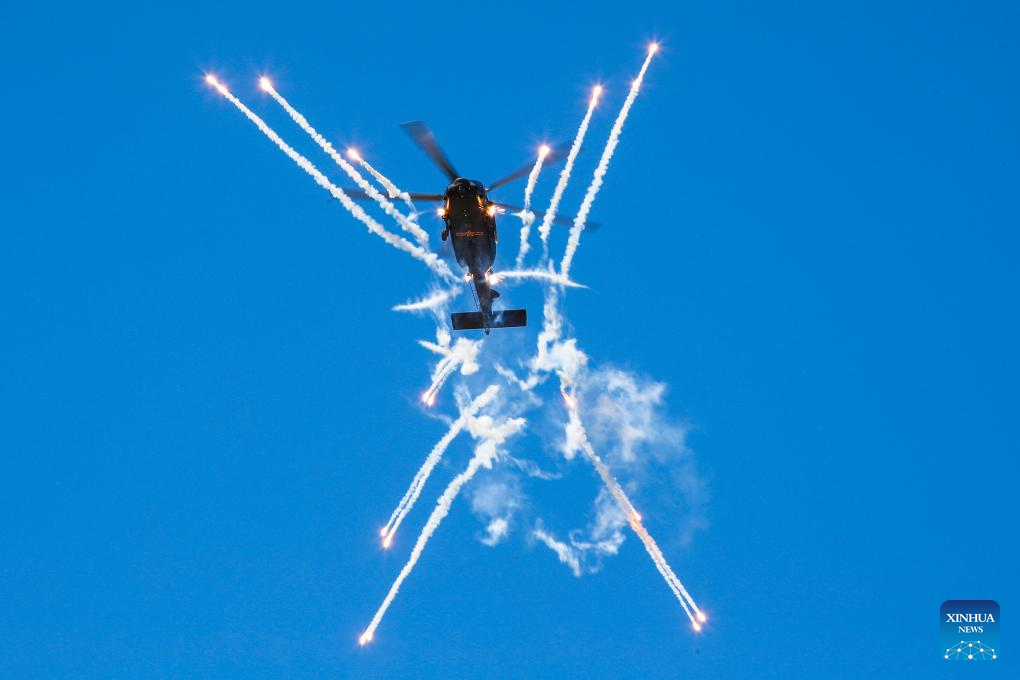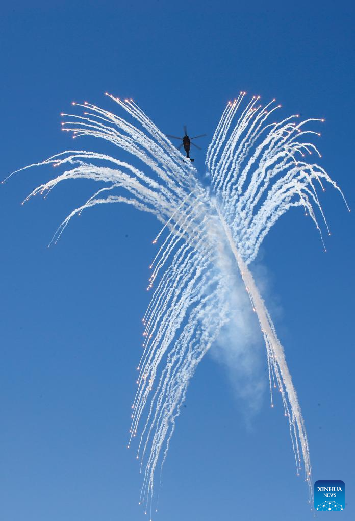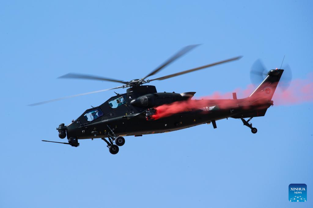 TIANJIN, 15 septiembre, 2023 (Xinhua) -- Imagen del 14 de septiembre de 2023 de un helicóptero del equipo acrobático Fenglei de China durante una presentación en la ceremonia de inauguración de la VI Exposición de Helicópteros de China, en la municipalidad de Tianjin, en el norte de China. La VI Exposición de Helicópteros de China fue inaugurada el jueves en la municipalidad de Tianjin, en el norte de China, destacando la innovación, el desarrollo y la cooperación beneficiosa para todas las partes. La exposición acogerá actividades como exposiciones, foros, exhibiciones aéreas, lanzamientos de nuevos productos y negociaciones comerciales, y tiene como objetivo promover la innovación, la cooperación y el desarrollo en la industria mundial de helicópteros. Se espera que atraiga a más de 60.000 visitantes. (Xinhua/Zhang Yongjin)