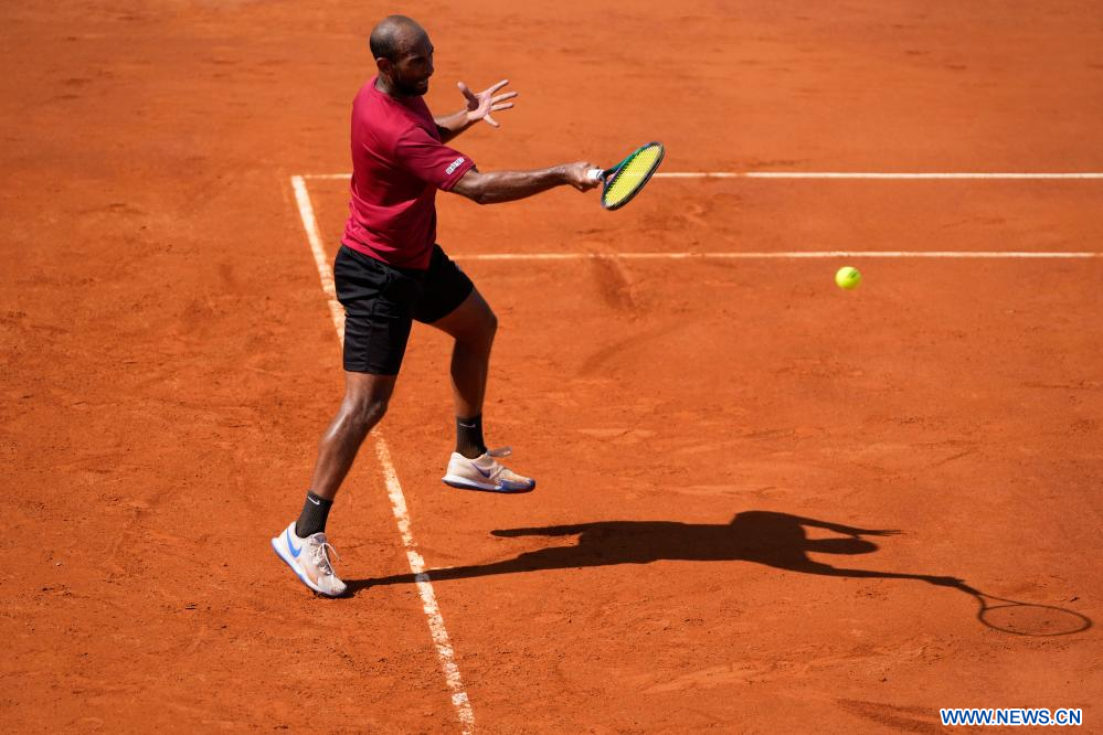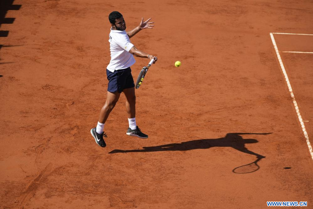 MONTEVIDEO, 16 septiembre, 2023 (Xinhua) -- Karim-Mohamed Maamoun, de Egipto, devuelve la pelota a Franco Roncadelli, de Uruguay, durante el partido individual correspondiente al Grupo Mundial II de la Copa Davis, celebrado en el Carrasco Lawn Tennis Club, en Montevideo, capital de Uruguay, el 16 de septiembre de 2023. (Xinhua/Nicolás Celaya)