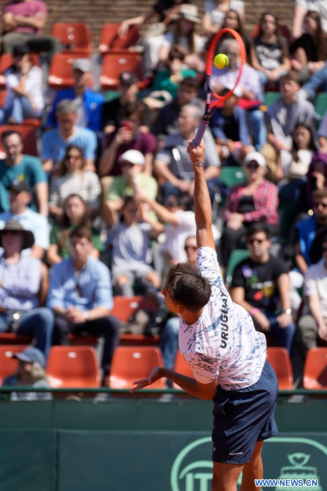 MONTEVIDEO, 16 septiembre, 2023 (Xinhua) -- Ignacio Carou, de Uruguay, sirve la pelota a Mohamed Safwat, de Egipto, durante el partido individual correspondiente al Grupo Mundial II de la Copa Davis, celebrado en el Carrasco Lawn Tennis Club, en Montevideo, capital de Uruguay, el 16 de septiembre de 2023. (Xinhua/Nicolás Celaya)