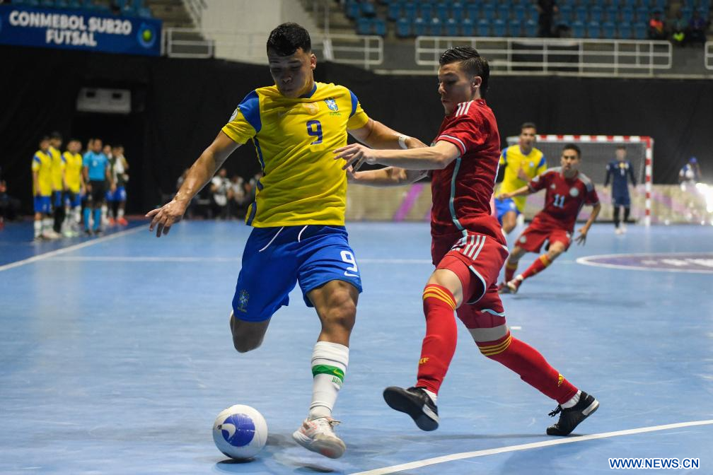 LA GUAIRA, 17 septiembre, 2023 (Xinhua) -- Imagen del 16 de septiembre de 2023 de Bruno Andrade (i), de Brasil, disputando el balón con Sebastián Toro (d), de Colombia, durante el partido correspondiente a la fase final de la copa CONMEBOL Sub20 Futsal 2022, celebrado en el Domo José María Vargas, en el estado La Guaira, Venezuela. (Xinhua/Marcos Salgado)