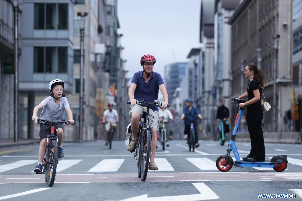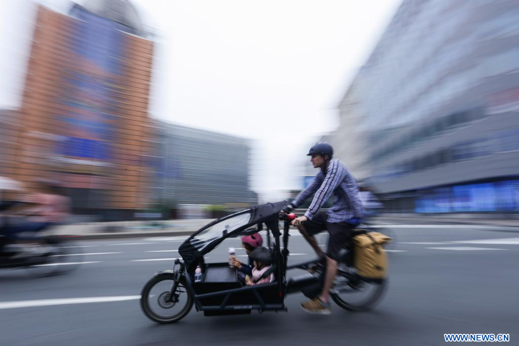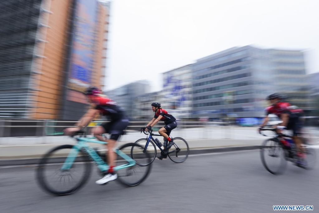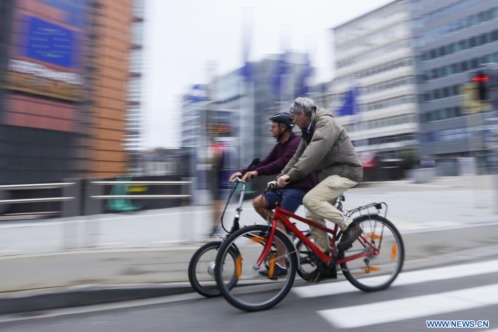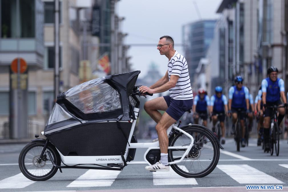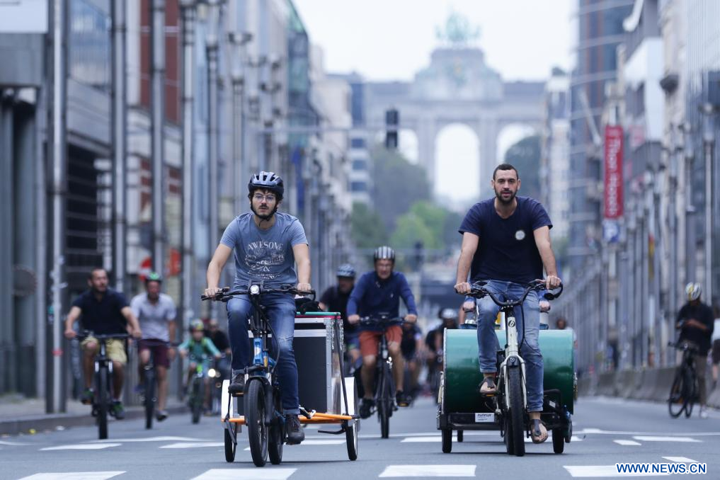 BRUSELAS, 17 septiembre, 2023 (Xinhua) -- Personas montan bicicletas en el Domingo sin Automóviles, en Bruselas, Bélgica, el 17 de septiembre de 2023. El evento anual "Domingo sin Automóviles" se celebró en la capital belga el domingo, ofreciendo al público la oportunidad de redescubrir la ciudad utilizando medios de transporte alternativos. Durante el día, toda la región de Bruselas se cierra al tráfico desde las 9:30 a.m hasta las 19:00 p.m., con la excepción del transporte público, taxis, emergencias, policía y personas con un permiso especial. (Xinhua/Zheng Huansong)
