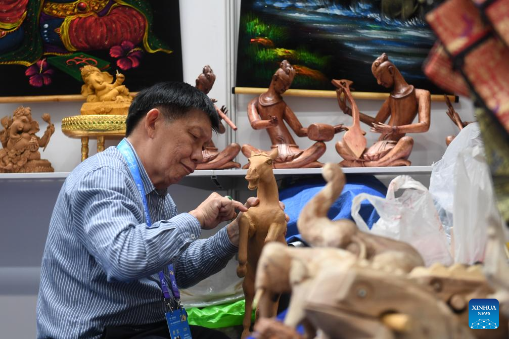 NANNING, 18 septiembre, 2023 (Xinhua) -- Un expositor clasifica productos básicos de Tailandia en el Centro Internacional de Conferencias y Exposiciones de Nanning, en Nanning, capital de la región autónoma zhuang de Guangxi, en el sur de China, el 18 de septiembre de 2023. La 20ª Exposición China-ASEAN abrió sus puertas el sábado en Nanning, capital de la región autónoma de la etnia zhuang de Guangxi, en el sur de China, con la asistencia de casi 2.000 empresas. Alrededor de 640 empresas de los miembros de la Asociación de Naciones del Sudeste Asiático (ASEAN) presentaron una amplia gama de productos básicos durante la exposición. (Xinhua/Lu Boan)