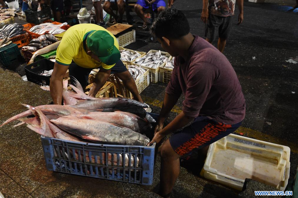 BELEM, 9 septiembre, 2023 (Xinhua) -- Pescadores transportan una caja con pescado en un puesto de pescado en el Mercado Ver-o-Pes, en Belém, estado de Pará, Brasil, el 9 de septiembre de 2023. (Xinhua/Lucio Tavora)