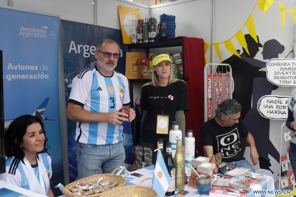 LIMA, 22 septiembre, 2023 (Xinhua) -- Personas esperan en un estand de la I Feria Internacional de Cultura, Turismo y Educación de Miraflores, en Lima, Perú, el 22 de septiembre de 2023. (Xinhua/Mariana Bazo)