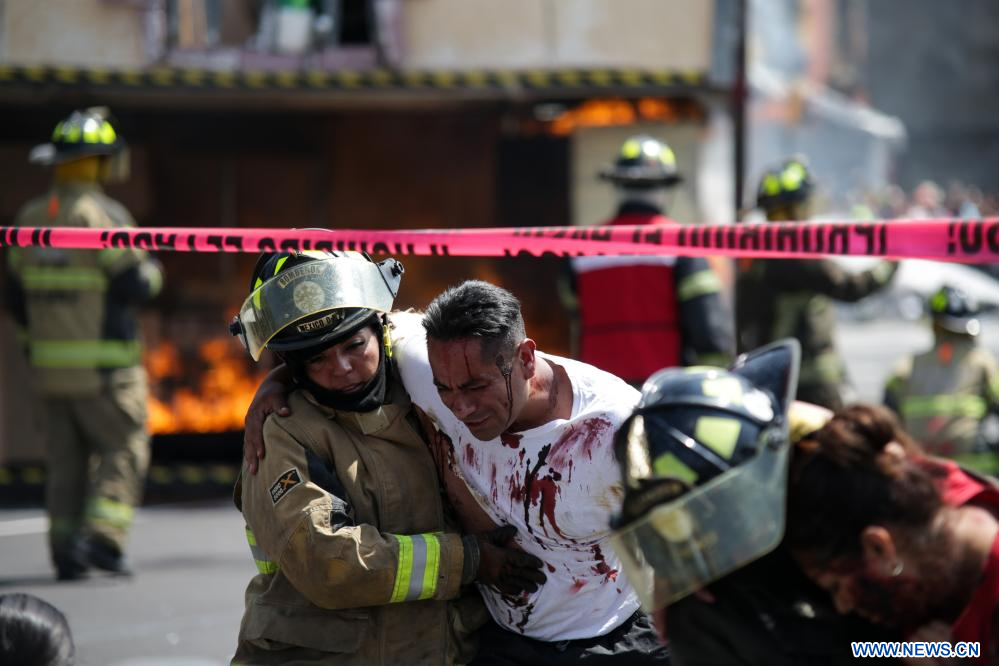 CIUDAD DE MEXICO, 20 septiembre, 2023 (Xinhua) -- Imagen del 19 de septiembre de 2023 de bomberos participando en el Segundo Simulacro Nacional 2023, en la Ciudad de México, capital de México. (Xinhua/Francisco Cañedo)